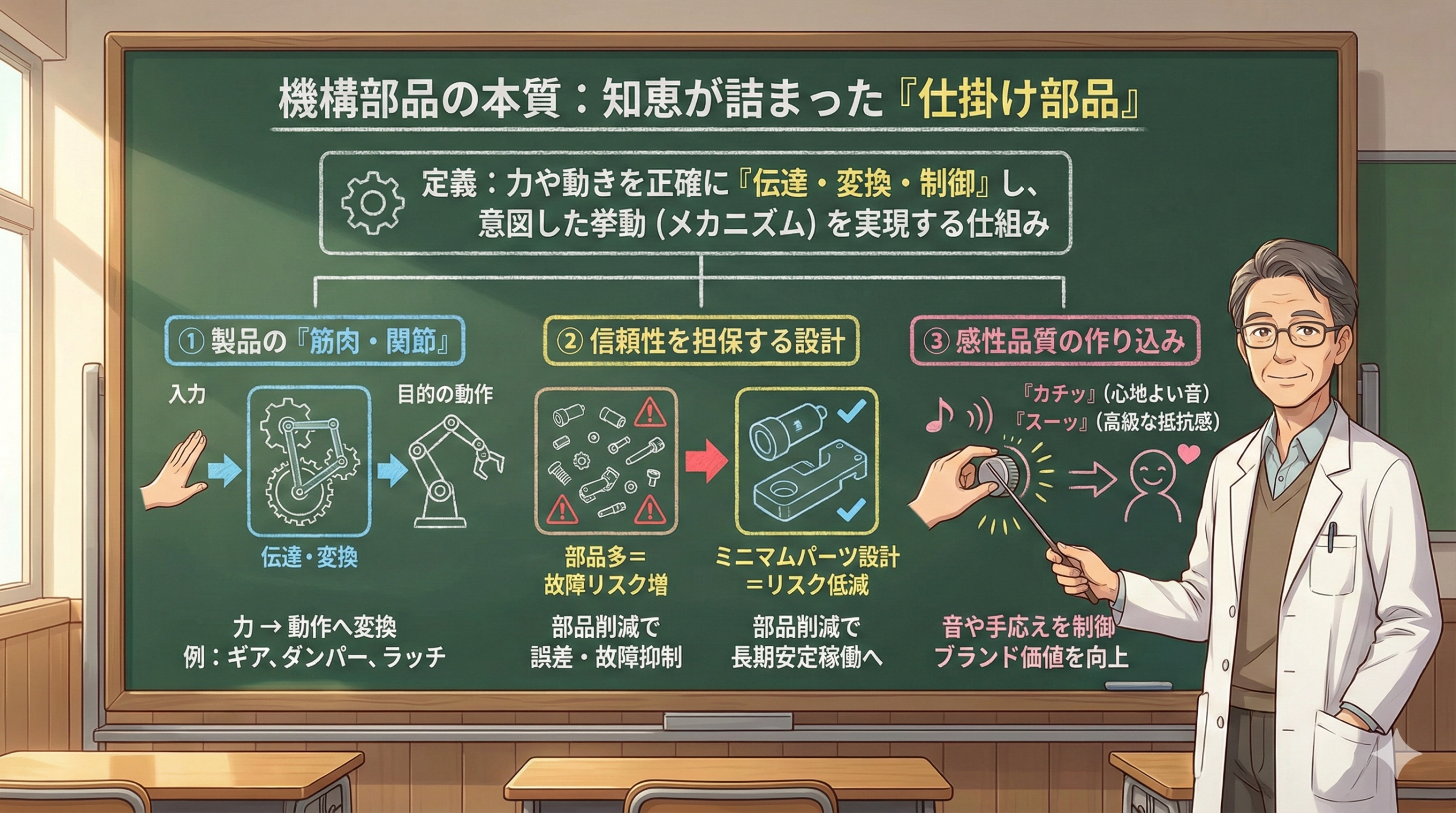 機構部品は、製品が道具として正しく機能するための物理的な「仕掛け」を構成する最小単位です。その本質は、加えられた力に対して「あらかじめ設計された通りの反応」を正確に返すことにあります。